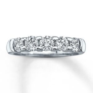 This romantic diamond anniversary band features five sparkling round diamonds with a total diamond weight of one carat, set in 14K white gold. Say "I love you now and always" with this fine jewelry anniversary ring.