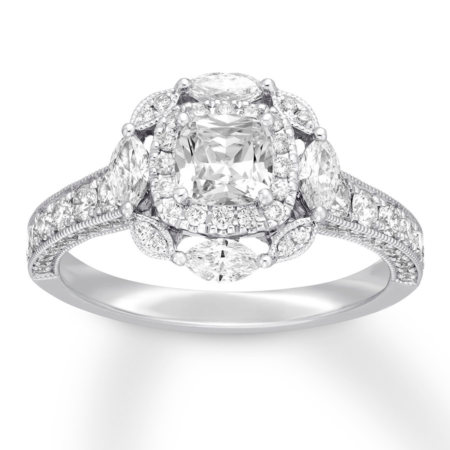 Combining vintage-inspired design with modern details, this remarkable engagement ring from displays a 3/4-carat cushion-cut diamond center framed in round diamonds. Marquise diamonds pair with duets of round diamonds to create the sparkling outer frame. Delicate milgrain and shimmering diamonds adorn the band to complement. Fashioned in polished 14K white gold, the ring has a total diamond weight of 1 5/8 carats.