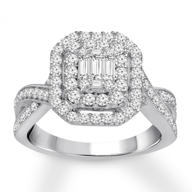 Combining classic and modern designs, this engagement ring is sure to captivate her The geometric center showcases baguette and round diamonds framed in two sparkling rows of round diamonds More diamonds and delicate milgrain decorate the twisting 14K white gold band to complement, bringing the total diamond weight to 1 carat Previously Owned Treasures are not eligible for in-store pickup Previously Owned Treasures may only be shipped either to your home address or to an alternate address