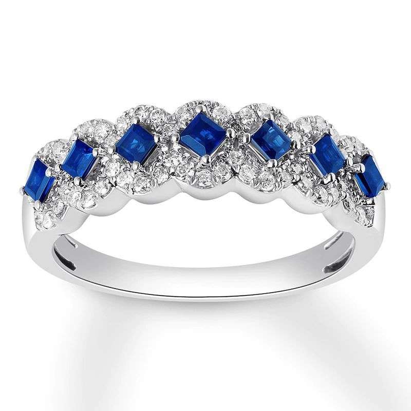 Square-cut natural sapphires are traced in sparkling curves of round diamonds in this stunning anniversary band. The ring is crafted of polished 10K white gold and has a total diamond weight of 1/4 carat.Item #: 533042901Content + CareSapphire is commonly subjected to enhancement processes or treatments such as heating and diffusion. Gently clean by rinsing in warm water and drying with a soft cloth.